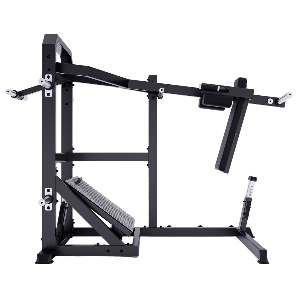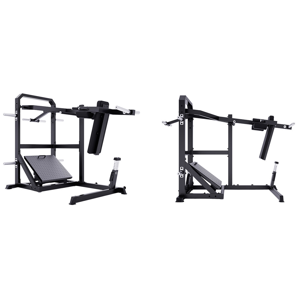 Ofrece un entrenamiento superior para el tren inferior gracias a su diseño innovador y funcional. Esta máquina permite un rango de movimiento amplio, profundo y totalmente controlado, ideal para realizar sentadillas efectivas que trabajan de forma precisa los principales grupos musculares. Cuenta con un respaldo amplio que garantiza una correcta y segura colocación del cuerpo, junto con soportes robustos que aportan máxima estabilidad. Todo esto asegura una experiencia de entrenamiento cómoda, segura y de alto rendimiento.